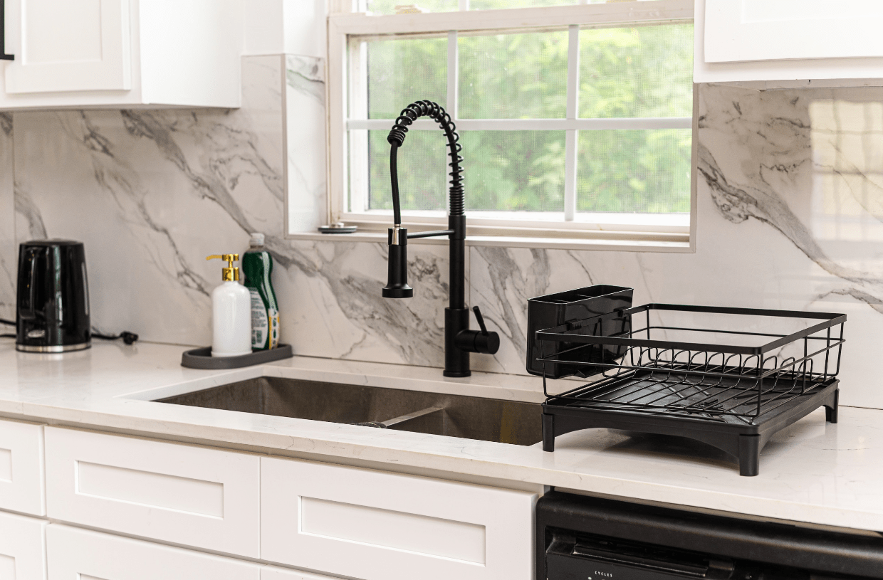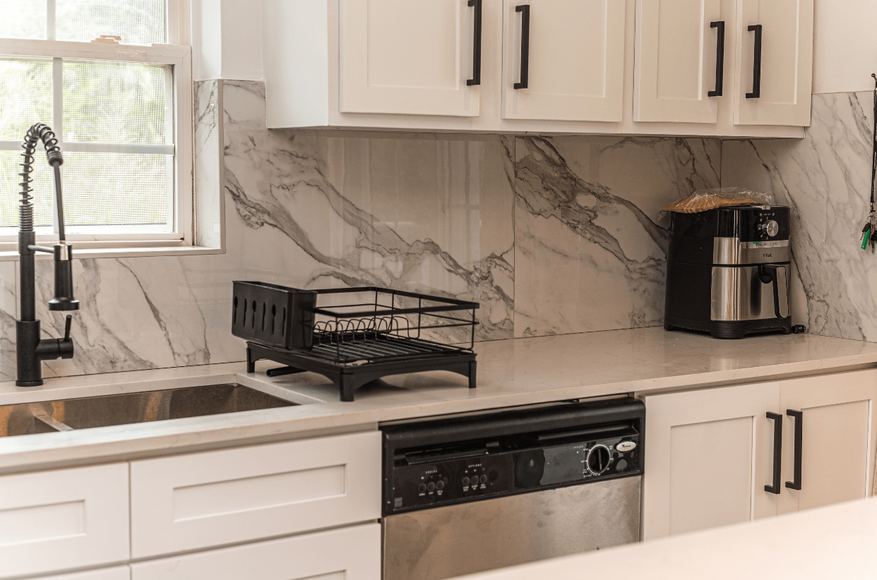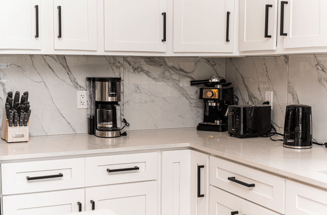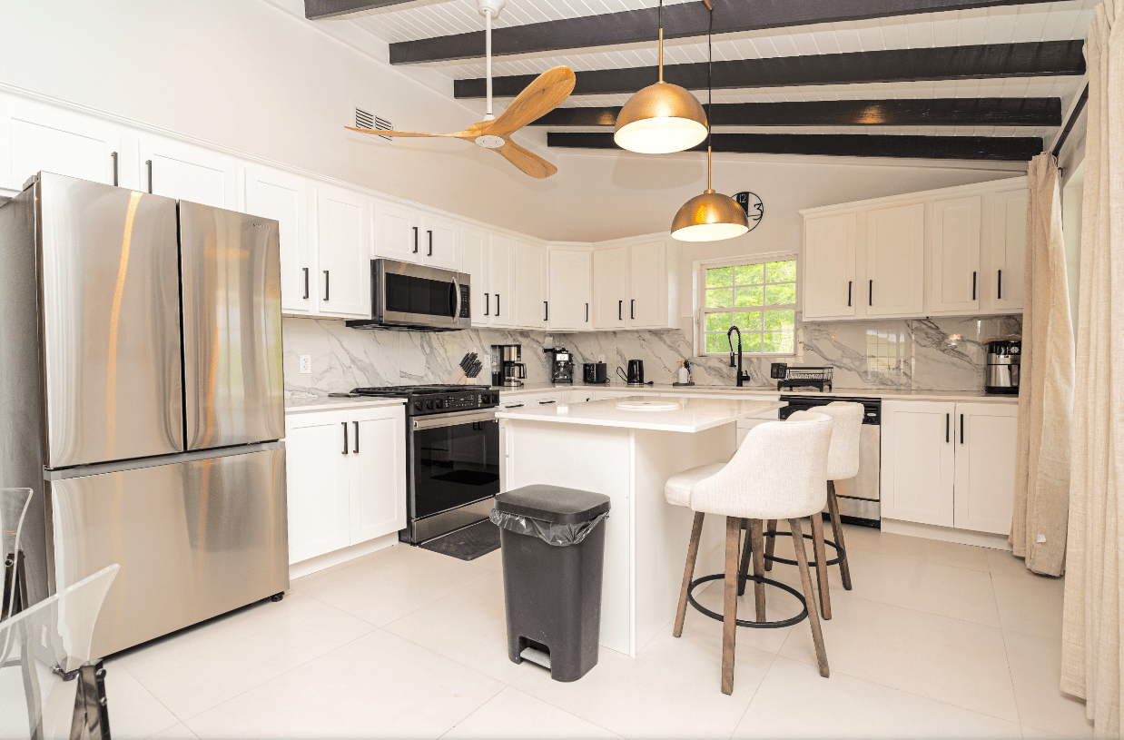 • A designer kitchen with stone countertops, marble backsplash, and state-of-the-art appliances, including a gas hob with air fryer, double fridge, microwave, dishwasher, and Ninja coffee & cappuccino makers