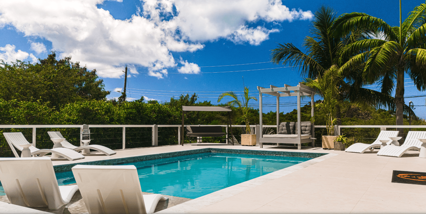 Enter through the sliding electric gate and step into paradise. The villa’s expansive saltwater pool is surrounded by lush Caribbean foliage and framed by breathtaking mountain views. Whether you’re soaking up the sun on a submerged pool lounge, reclining on the four-poster day bed, or swaying gently in the three-seater swing, you’ll find endless ways to unwind outdoors.