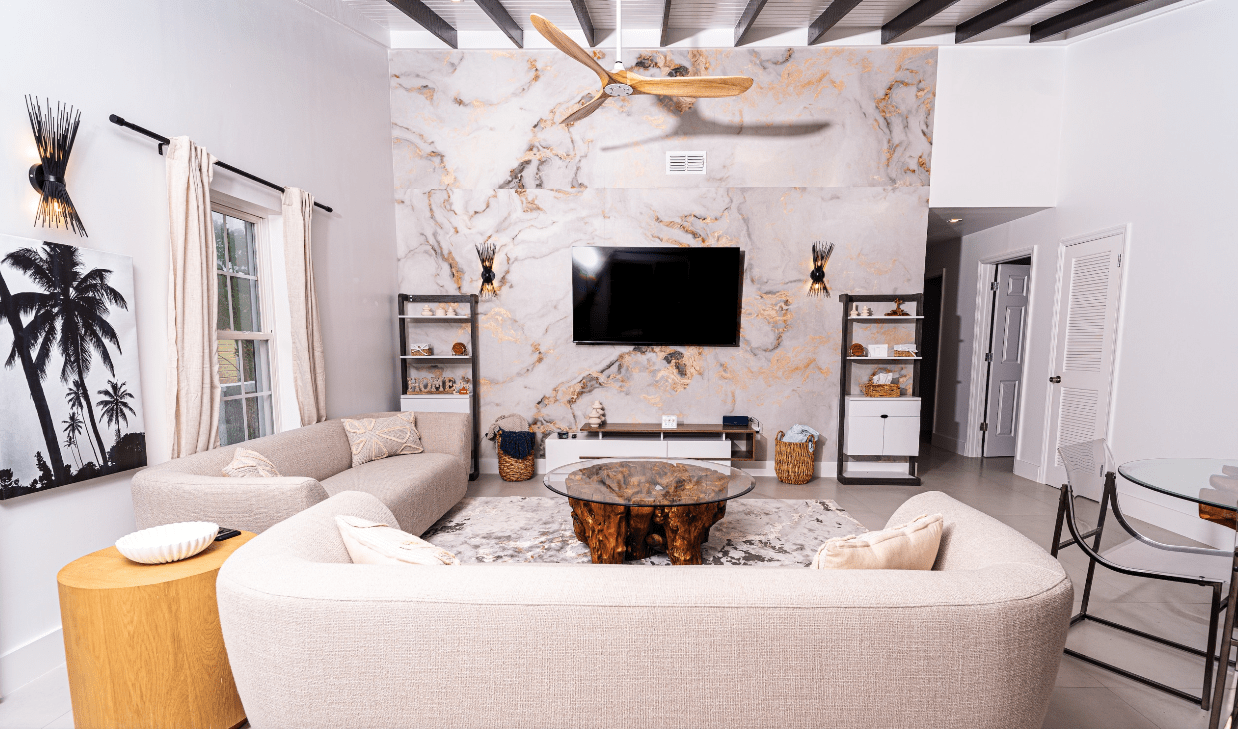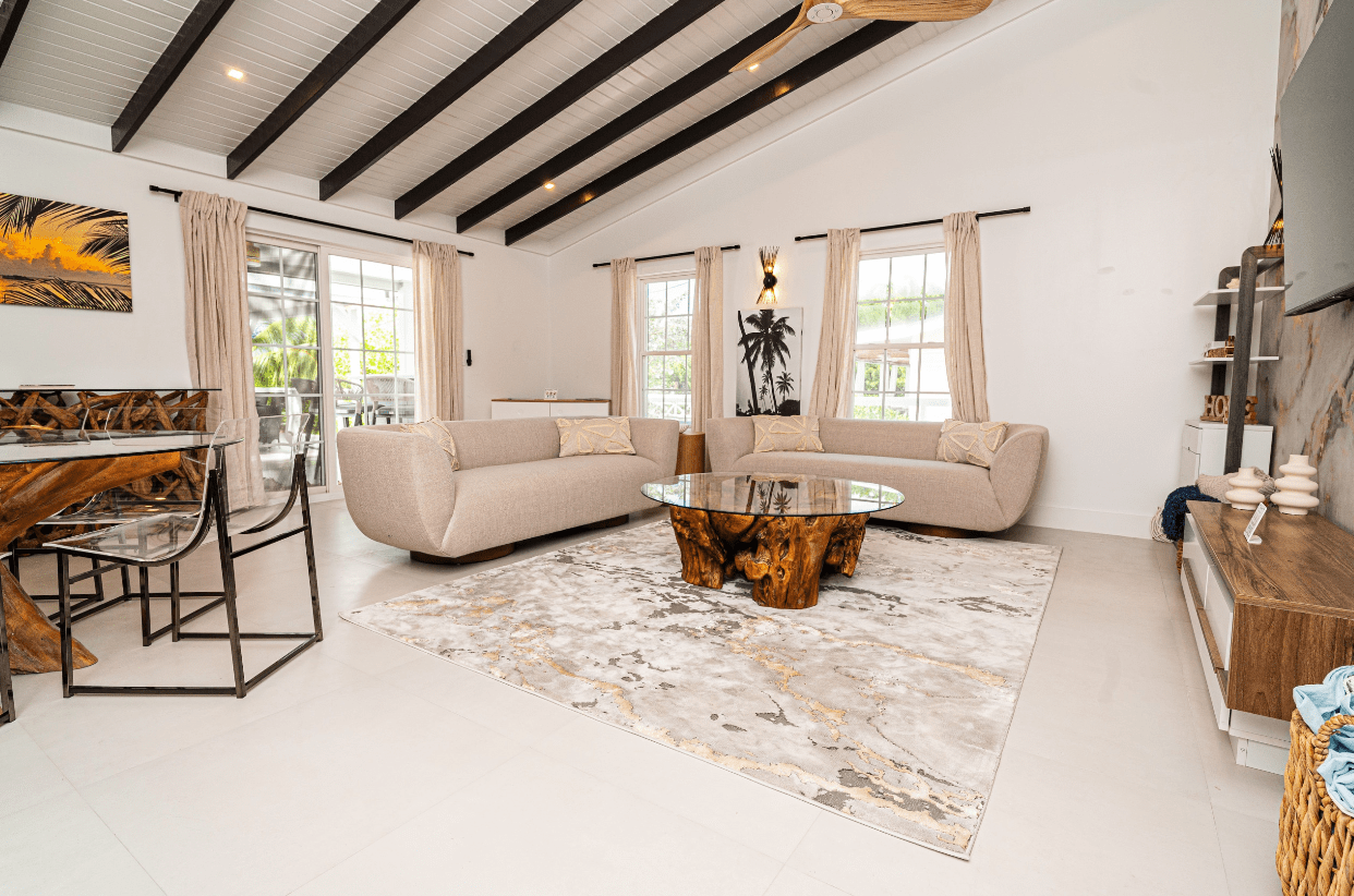 Inside, Villa Coby seamlessly blends contemporary luxury with natural elements for a refined yet relaxed vibe. The open-plan living space features a dramatic statement wall, vaulted Caribbean stone ceiling, and high-end décor that combines warm wood tones, tropical motifs, and elegant gold fixtures.
