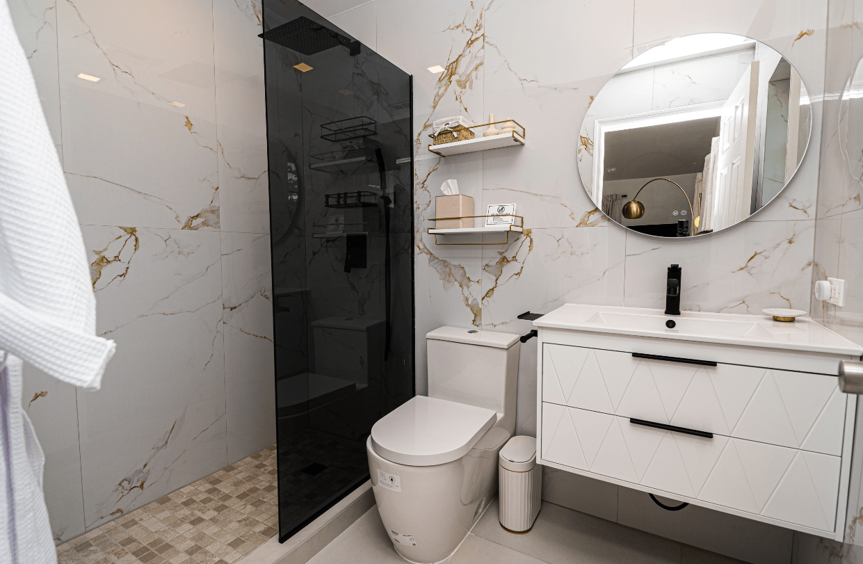 • Primary Suite: King bed, private seating area, 55” flat-screen TV, dual built-in wardrobes, and a luxurious marble-style en-suite with rainfall shower and gold-accented matte black fittings