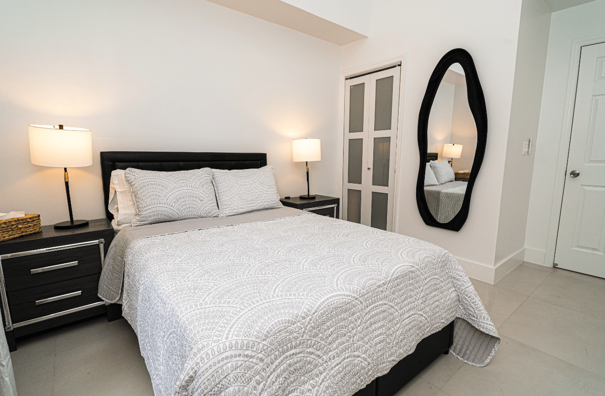 • Bedroom 4: Queen bed with black leather-style frame, full-length mirror, and built-in wardrobe