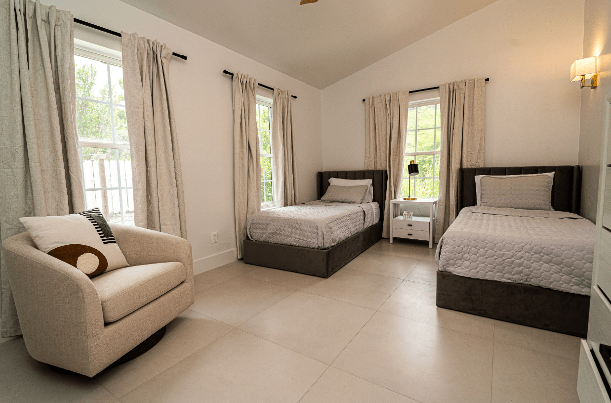 • Bedroom 3: Two twin beds, built-in wardrobe, and seating